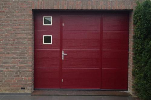 Sectionale garagedeur type houtnerf vlak RAL kleur 3005. Met loopdeur verlaagde drempel in Montfort.